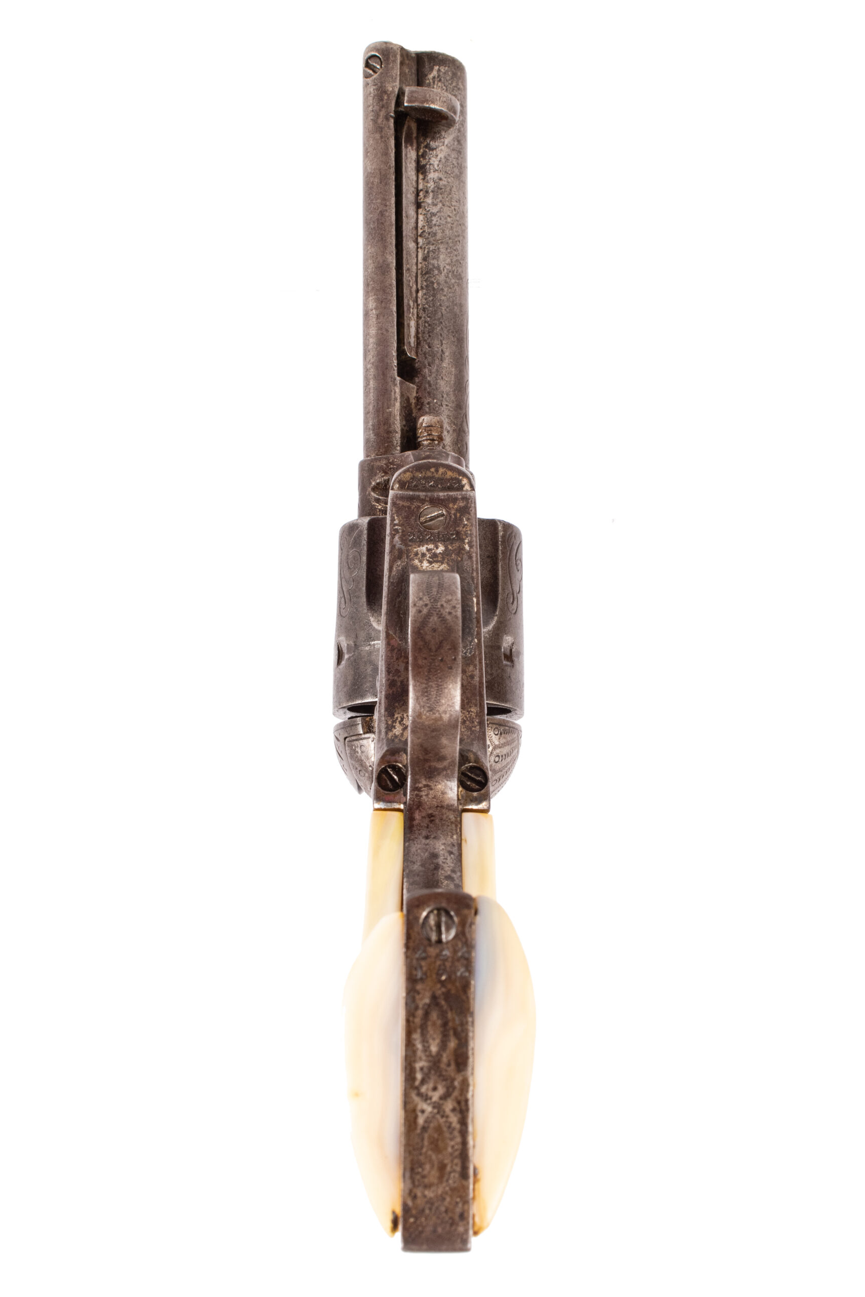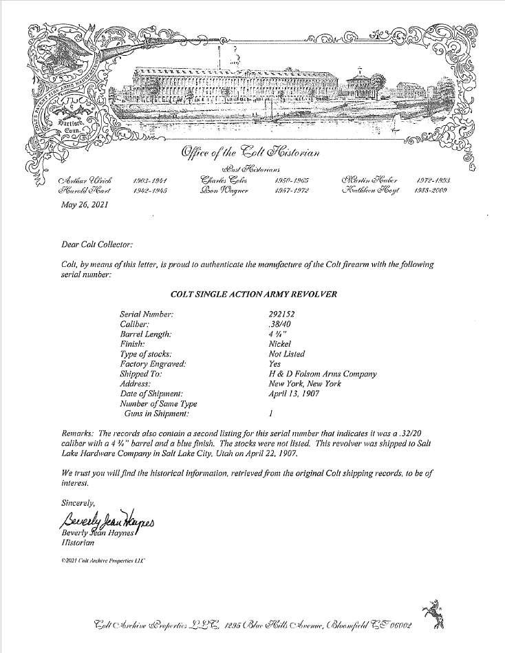 Colt Single Action Army chambered in 38-40 Winchester Centerfire with a 4¾ inch barrel, light-dark bore with minor pitting and defined rifling. This revolver was shipped from the factory in nickel finish retaining approximately 20-30% of the original nickel and features a hand scroll engraving complimented with genuine mother-of-pearl grips. Included with this revolver is a Colt factory letter showing its authenticity with a manufactured year of 1907 originally shipped to H & D Folsom Arms Company out of New York. Most notably; this revolver was the only firearm in the documented shipment. The NRA grading condition for this USED firearm is Fair.