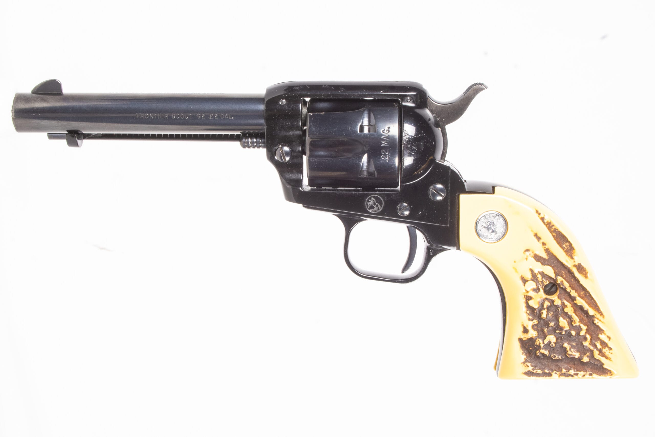 Colt Frontier Scout chambered for .22 Magnum with 4.75-inch barrel, blued steel, gutter sight, six-shot fluted cylinder, and faux stag grips with Colt medallions. Includes box and .22 Long Rifle cylinder. Action appears to be in excellent time and working order with mirror bright, sharply rifled bore. The NRA grading condition for this USED firearm is Good+.