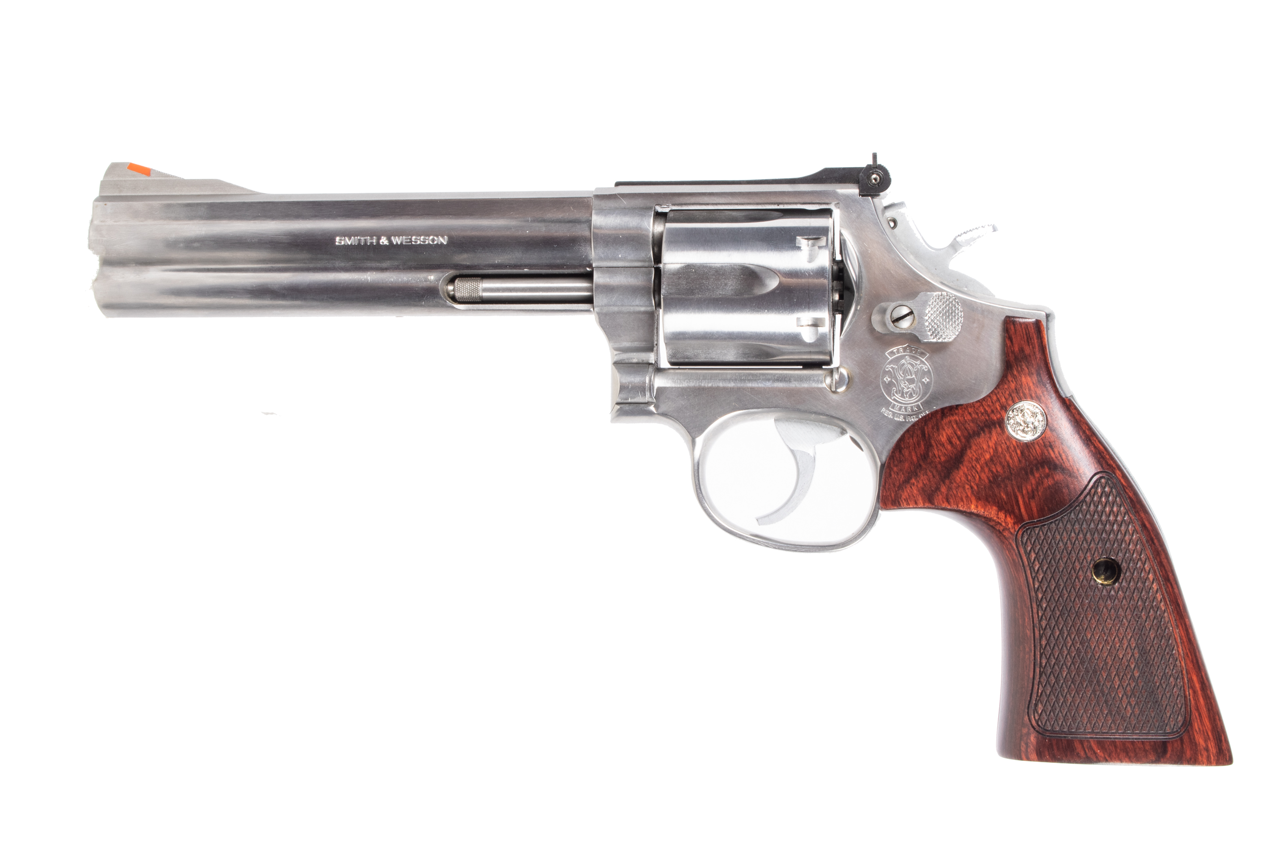 Smith & Wesson Model 686-3 revolver chambered in .357 Magnum (also accepts .38 Special), featuring a desirable 6 inch barrel that delivers excellent balance, sight radius, and accuracy for target shooting, range use, or collecting. Built on the proven L-Frame, this revolver features a 6-shot cylinder and smooth double-action/single-action operation. This example is in NRA Excellent condition, showing a very clean stainless finish with only minor handling marks visible under light. The bore is bright with strong, visible rifling, and as shown in the photos it is equipped with an adjustable rear sight and an orange insert front sight for quick sight acquisition. This revolver includes the original factory grips as well as the original factory box, making it a highly desirable complete package for the Smith & Wesson collector or shooter.