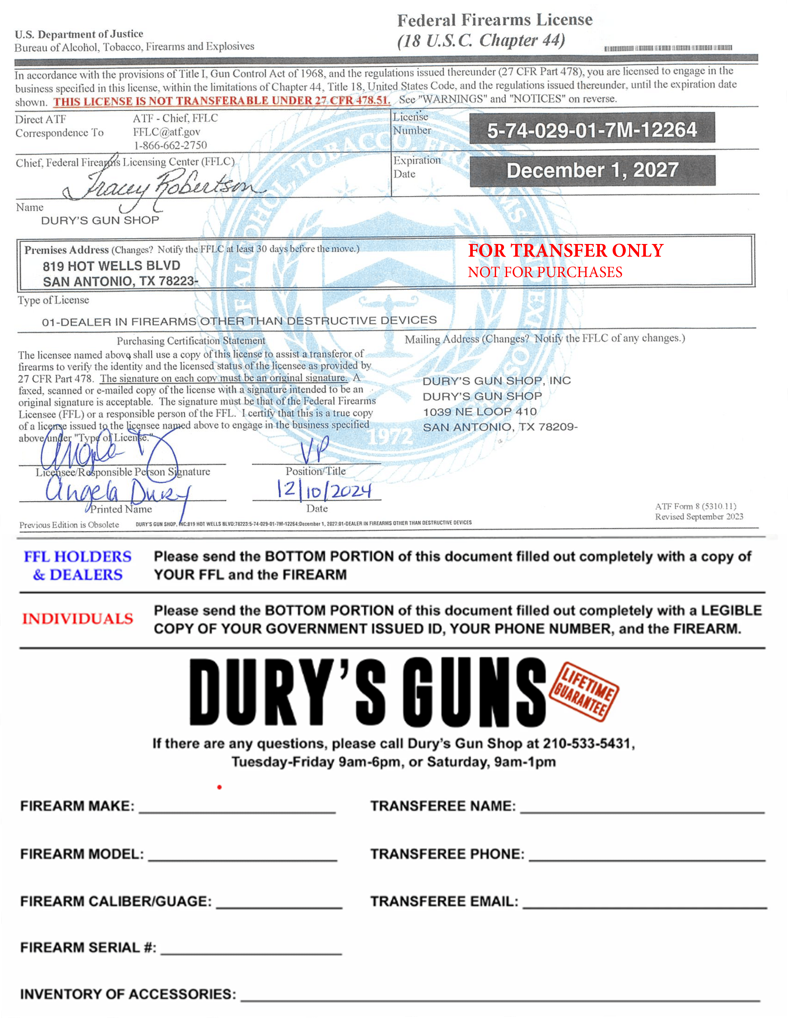 Dury’s is always ready to help you transfer a gun. If you need us to send a copy of our FFL to another dealer or person, please make a copy of our FFL to send to them or have them print a copy from this page, or you can always call and talk to any of our salespeople if you have questions about this process.
